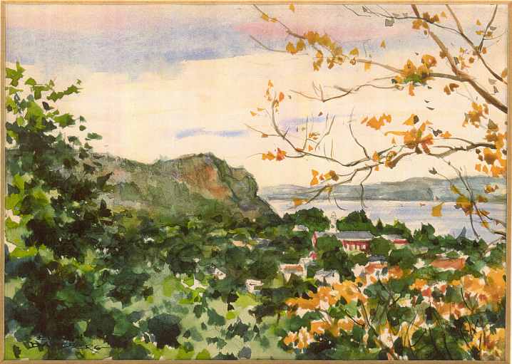 Watercolor painting of the Hudson, the Hook, and Nyack HS by Edwin Dahlberg, Karen's Dad. Karen gave a copy to all classmates at the reunion.